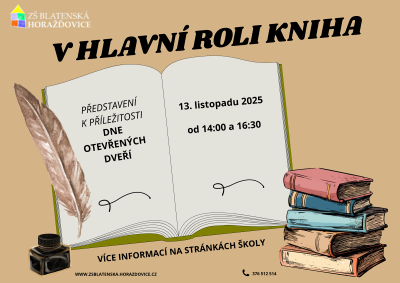 Co nás čeká 13. 11. 2025? Stejně jako každý jiný rok akce, na níž se všichni naši žáci, ale i učitelé velmi pečlivě připravují – Den otevřených dveří. Letos proběhne ve znamení dychtivých čtenářů. I název V hlavní roli kniha o všem vypovídá. Tímto dnem nás opět provedou a moderátorskou roli si vyzkouší převážně žáci 9. tříd. I zde však dojde k menším změnám, neboť to vše nebude ležet pouze na bedrech dvou hlavních jedinců, ale na několika. I oni před bohatým vystoupením jednotlivých tříd sepíší příběh založený na vlastních zkušenostech ze školních lavic. Proto si nenechte ujít tento jedinečný zážitek a přijďte 13. 11. mezi nás. Těšíme se na Vás.