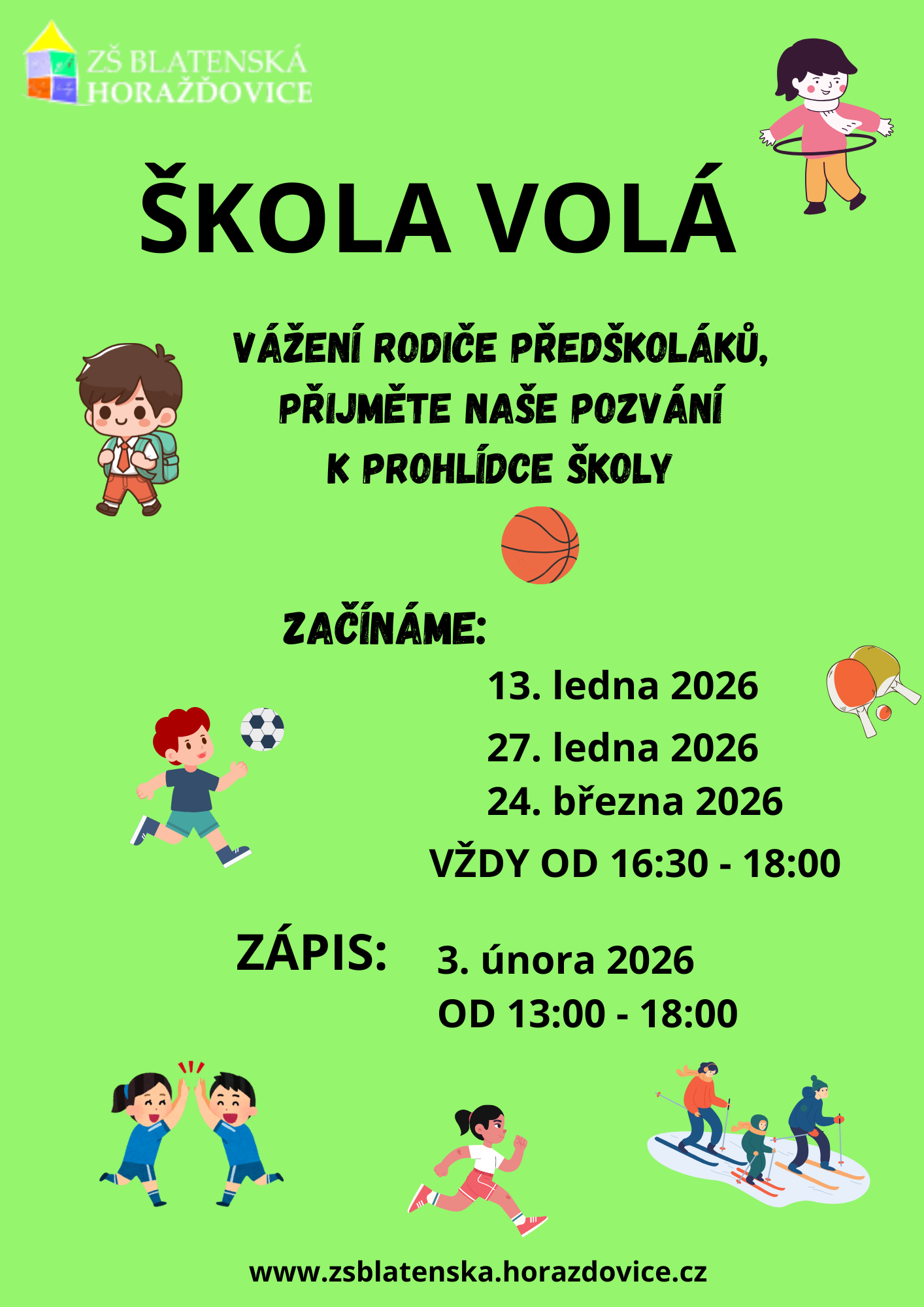 naše škola připravila i v letošním školním roce pro předškoláky program nazvaný ŠKOLA VOLÁ, který bude zaměřen na přípravu dětí pro vstup do 1. třídy a na jejich bezproblémovou adaptaci na školu. Setkání se budou konat v odpoledních hodinách, aby nejen děti, ale i rodiče mohli zhlédnout naši moderně vybavenou školu a práci všech pedagogů. První setkání se uskuteční v úterý 13. ledna 2026 v čase od 16:30. Zde se seznámíte se všemi pedagogy 1. stupně, s vychovatelkami školní družiny a školního klubu. Druhé setkání proběhne v úterý 27. ledna 2026 od 16:30 pod taktovkou pedagogů 2. stupně. Program bude určitě pestrý a zajímavý, mimo jiné si děti zacvičí v naší velké tělocvičně. A pak už nastane den D pro každého předškoláka! Třetí setkání bude ZÁPIS 2026, brány naší školy se vám a vašim dětem otevřou 3. února 2026 v době od 13:00 do 18:00. Na čtvrté setkání vás pozveme v úterý 24. března 2026, opět v čase od 16:30. Co nás bude čekat? Děti z 1. stupně nám zazpívají, zarecitují…, rodiče budou mít možnost pobesedovat s vedením školy a pedagogy..., pro děti bude opět připraven program..., na závěr si dáme něco dobrého na zub. Vážení rodiče, milí předškoláci, všichni se na vás na Blatenské moc těšíme.