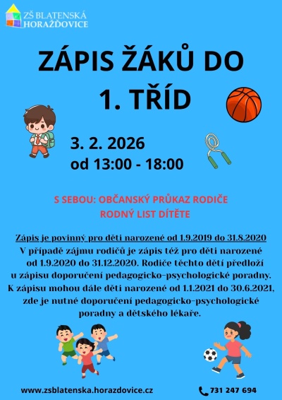 Zápis proběhne v úterý 3. února 2026 od 13:00 do 18:00. Organizace zápisu – viz leták MŠMT Zápis do ZŠ – informace pro rodiče.
